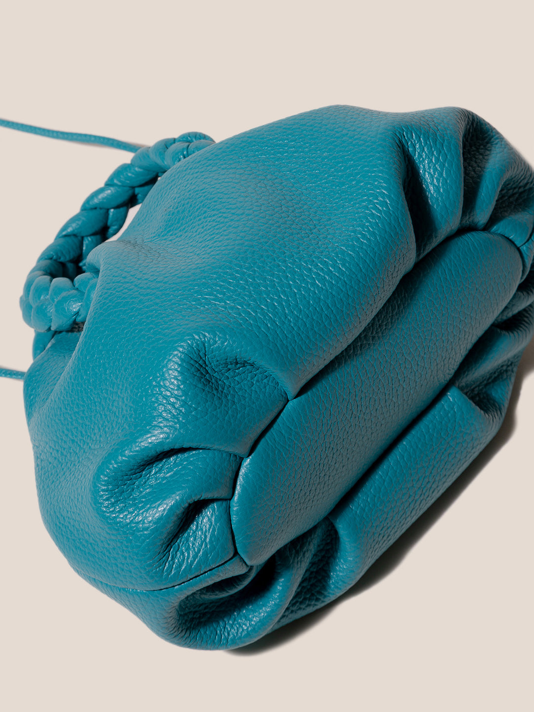 ボンボングレイニー プリーティドハンドル レザー ハンドバッグ (ティール)。