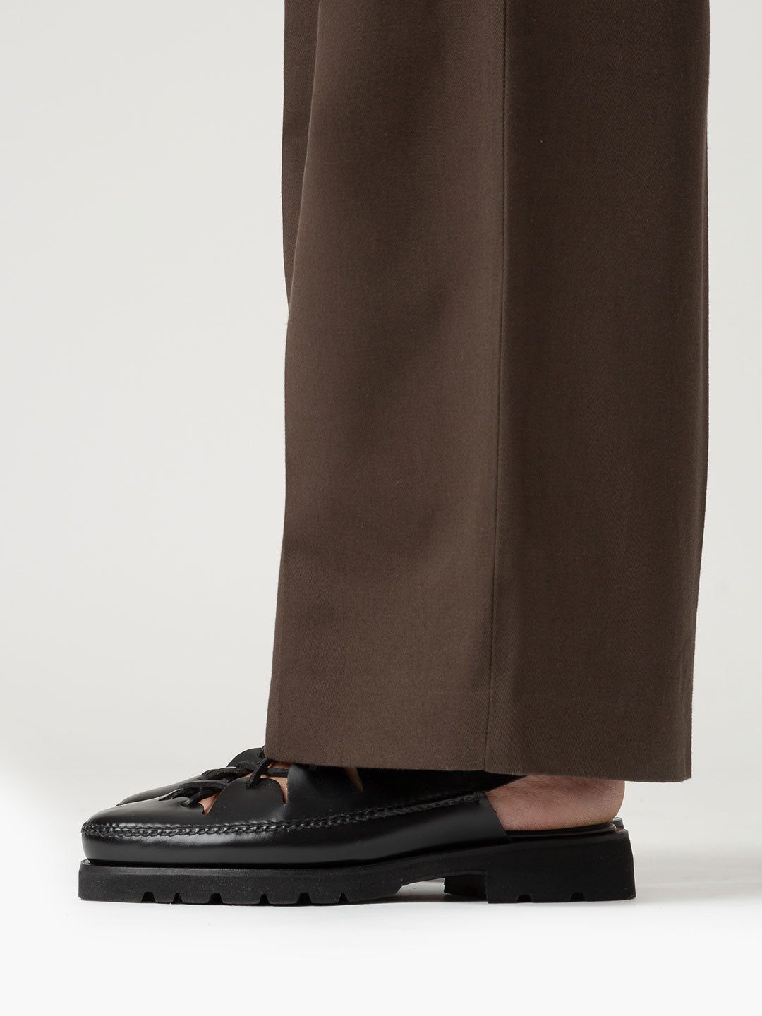 レースディテールをあしらったスリングバックローファー。ハリのあるカーフレザーで仕立て、軽量のブローンラバーソールを採用しています。