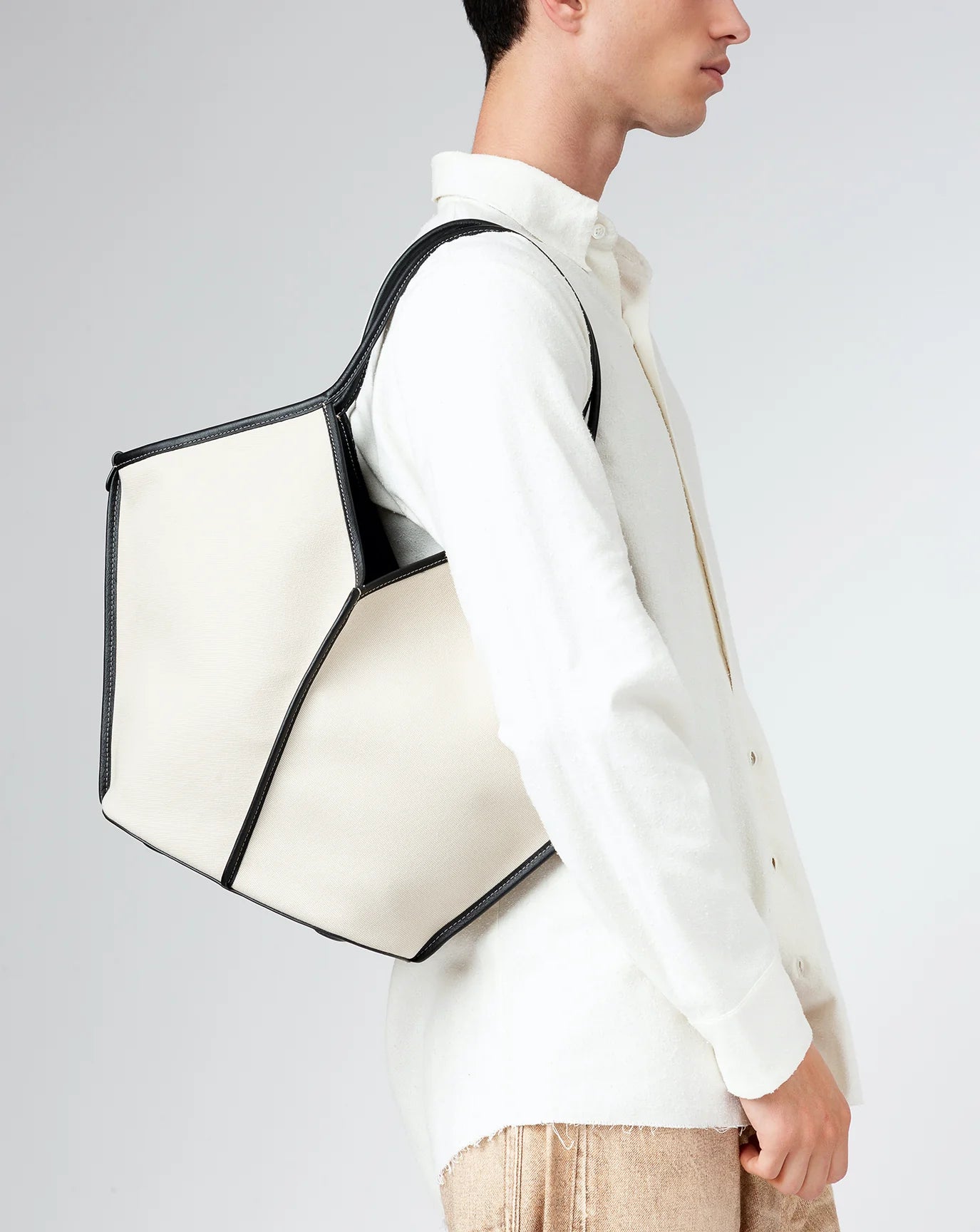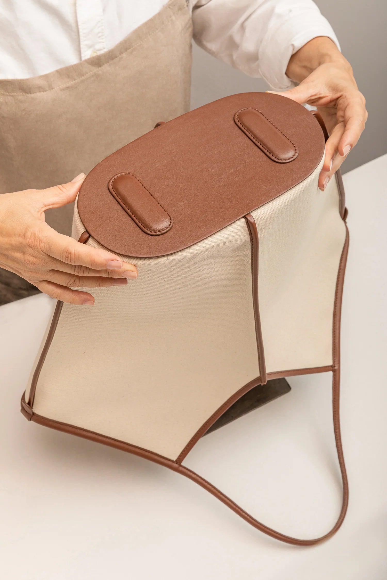 After repeated exploration and prototyping, the bag was born with an impressive, almost architectural look, made from high-quality leather and canvas, both of which are central elements in the HEREU visual.