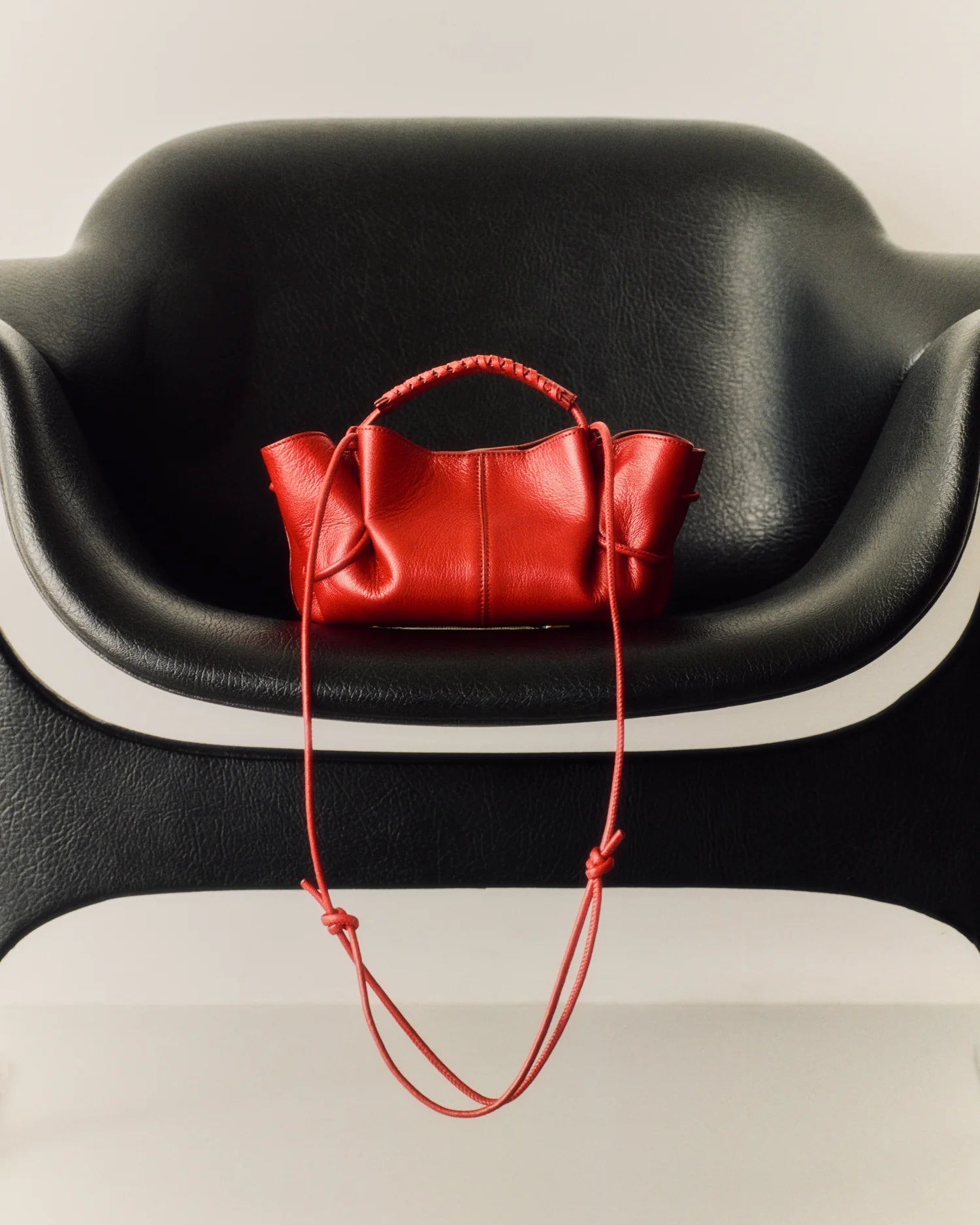 The pleated silhouette, Arta, is finished with a braided handle detail, convertible to an adjustable shoulder strap or tote handle for the crossbody mini version.