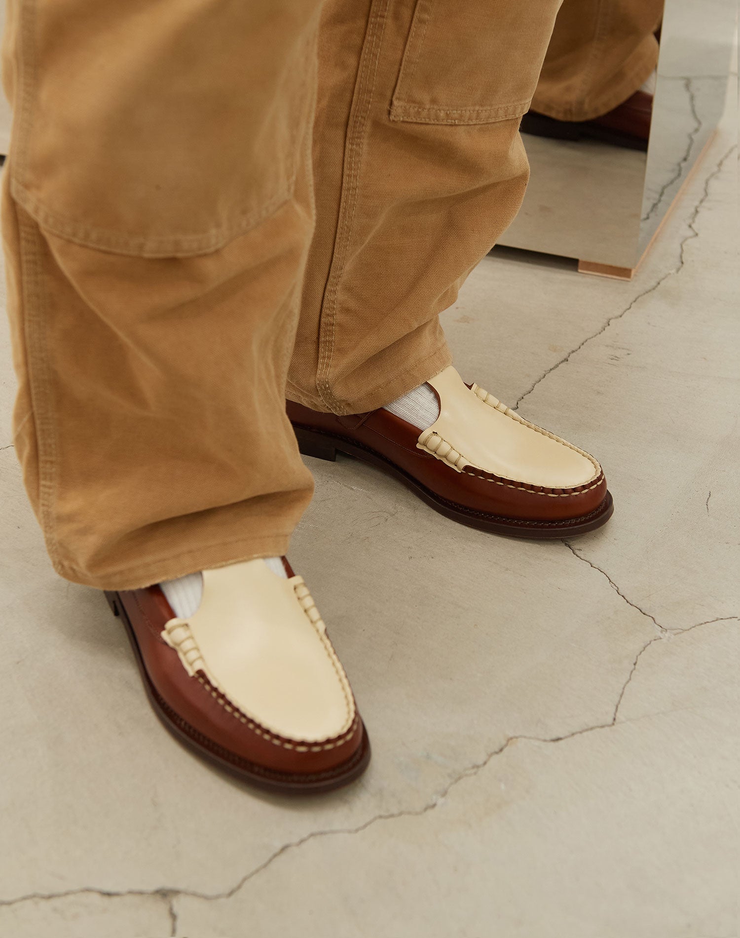 H 初めてそのアイディアを聞いたときは、とてもユニークだなと感じました。あまりHEREUではコンビネーションのデザインをやったことがないので、アッパーだけでも変えられないかと最初に提案があったのですが、せっかくなら希望の組み合わせでトライしてみたいとサンプルをあげてきました。