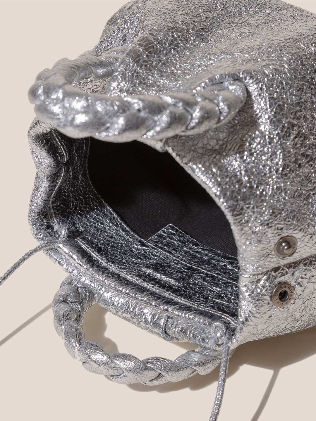 ボンボンクリンクルメタリック プリーティドハンドル レザー ハンドバッグ (ライトシルバー)。
