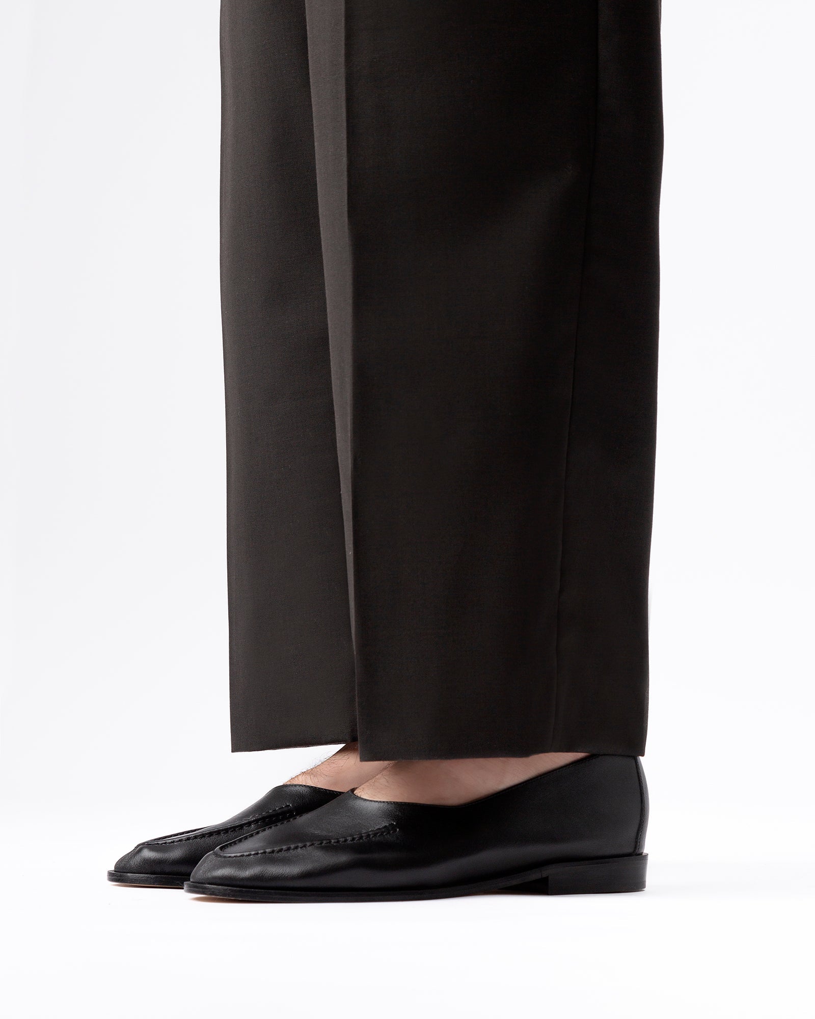 アッパーには伝統的なモカシンのディテールを取り入れつつ、履き口を大きくカットした大胆なデザインが特徴。 ブーツの重厚感とパンプスの軽やかさを併せ持つシルエットが、足元に抜け感とモダンな個性を添えます。